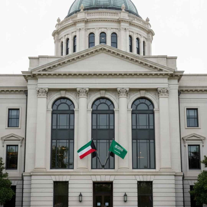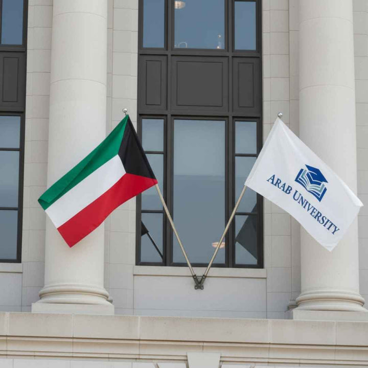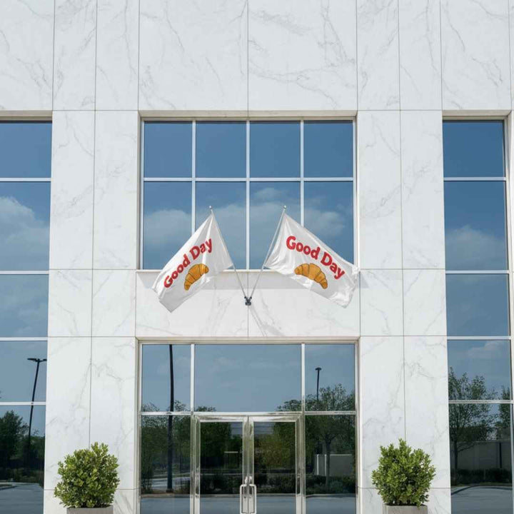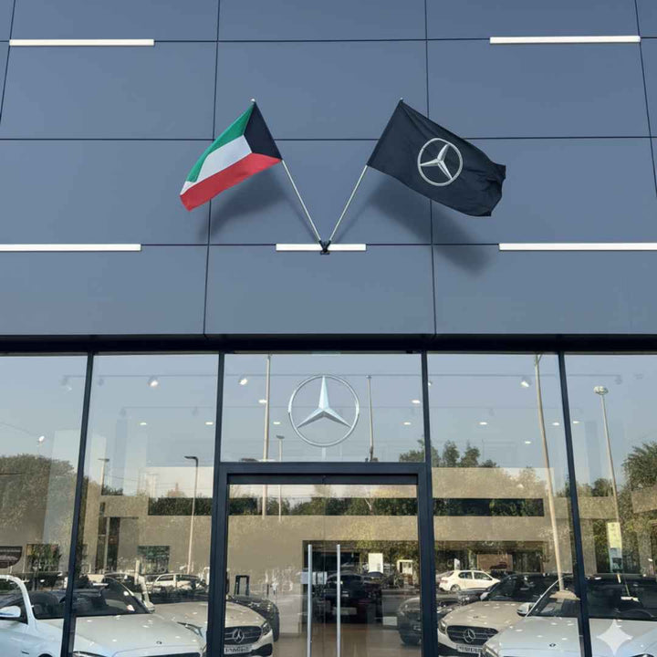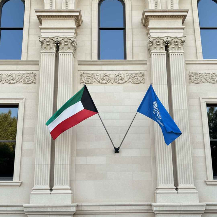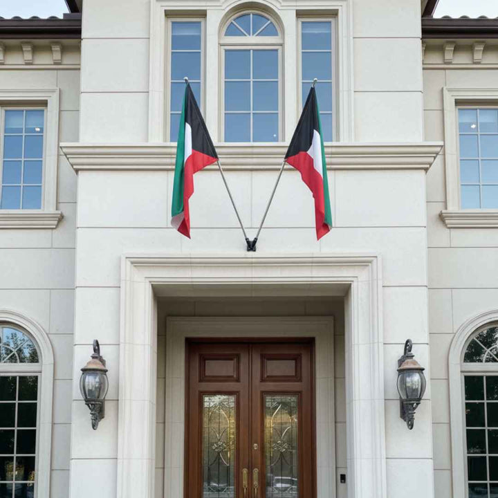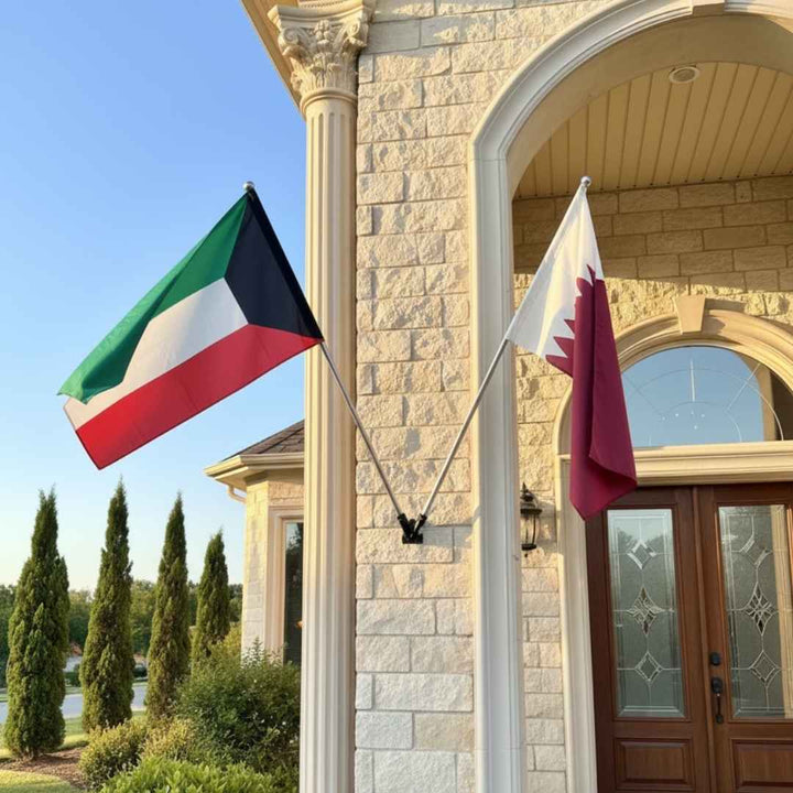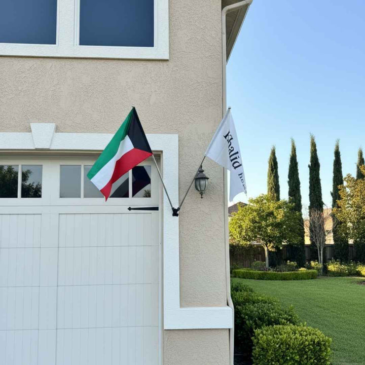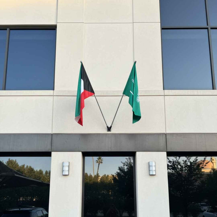 Karyan Art presents Custom Dual Wall Mount Flags, specially designed for displaying two flags side by side with elegance and strength. Built with a durable 150 cm (1.5 m) metal poles and a V-shaped black bracket, this outdoor flag system is ideal for showcasing national pride, corporate branding, or promotional messages in a highly visible way.