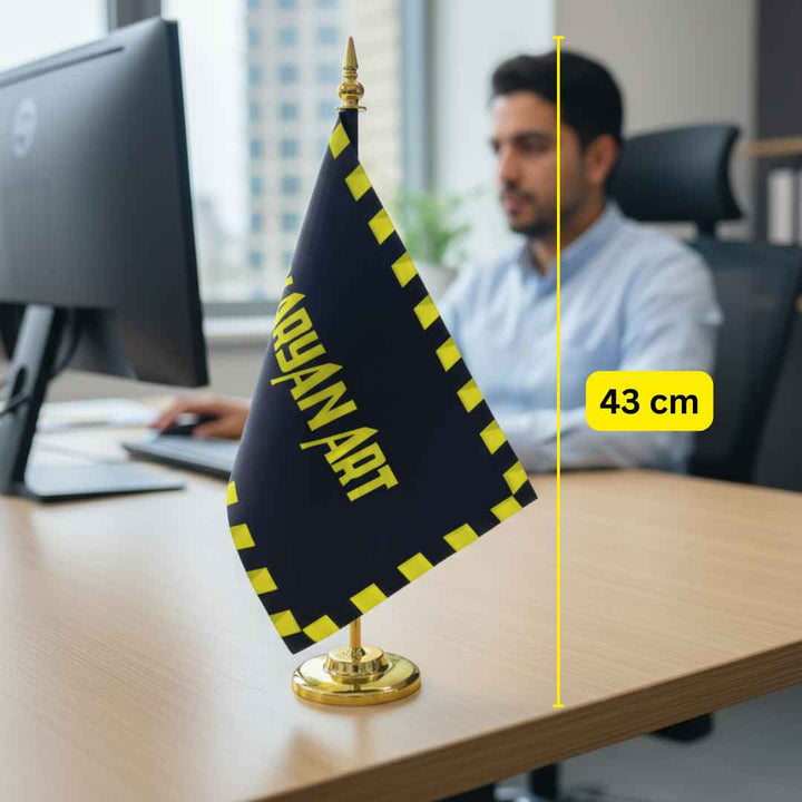 Karyan Art proudly introduces our exquisite Table Flags, designed to add sophistication and professionalism to any setting. With stands crafted from high-quality metal and available in luxurious Gold and Silver finishes, these flags are perfect for making a statement in both professional and personal environments.