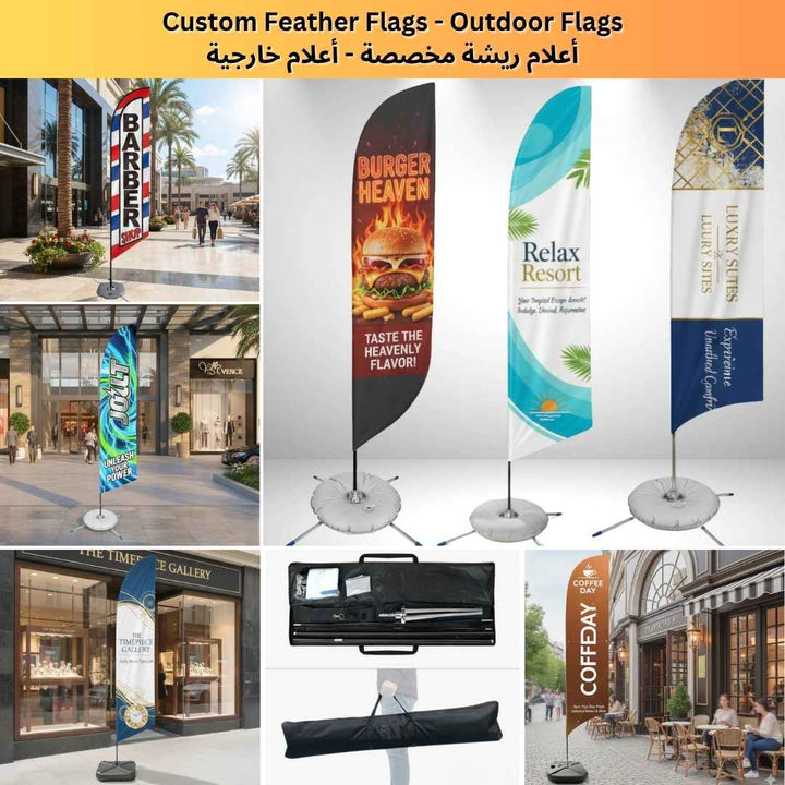 تميز عن الآخرين مع طباعة أعلام الريش المخصصة لدينا، فهي أداة مثالية للإعلان الخارجي مصممة لجذب الانتباه والترويج لعلامتك التجارية، فعاليتك، أو رسالتك من مسافة بعيدة. مصنوعة من مواد عالية الجودة وقابلة للتخصيص من حيث الشكل، الحجم، والتصميم، وتعتبر مثالية للأعمال، المؤسسات، ومنظمي الفعاليات الذين يسعون لظهور بارز وفعال.