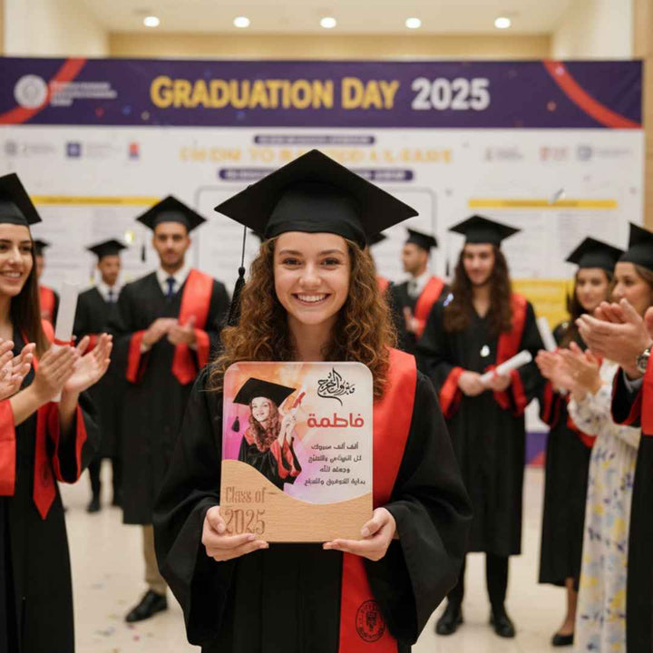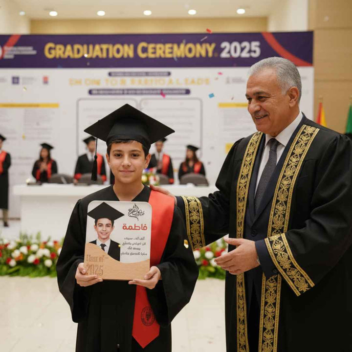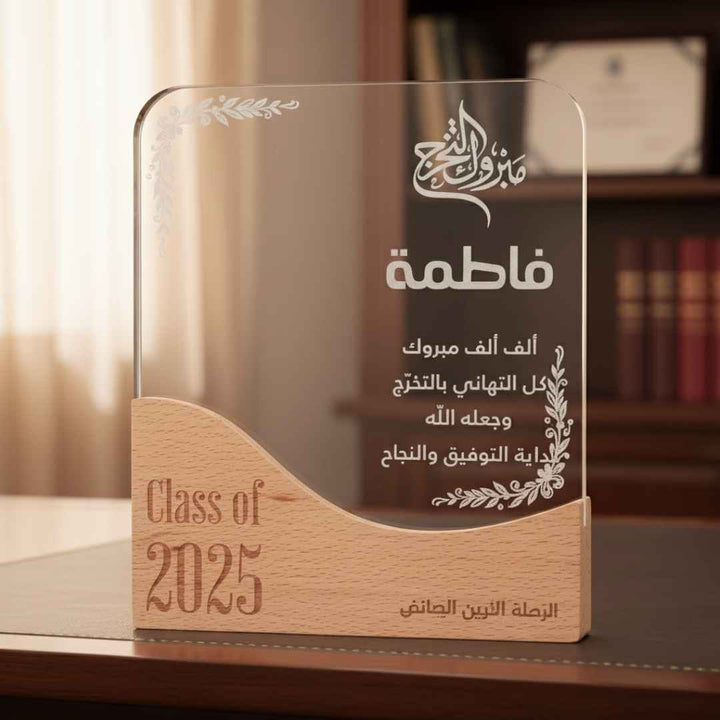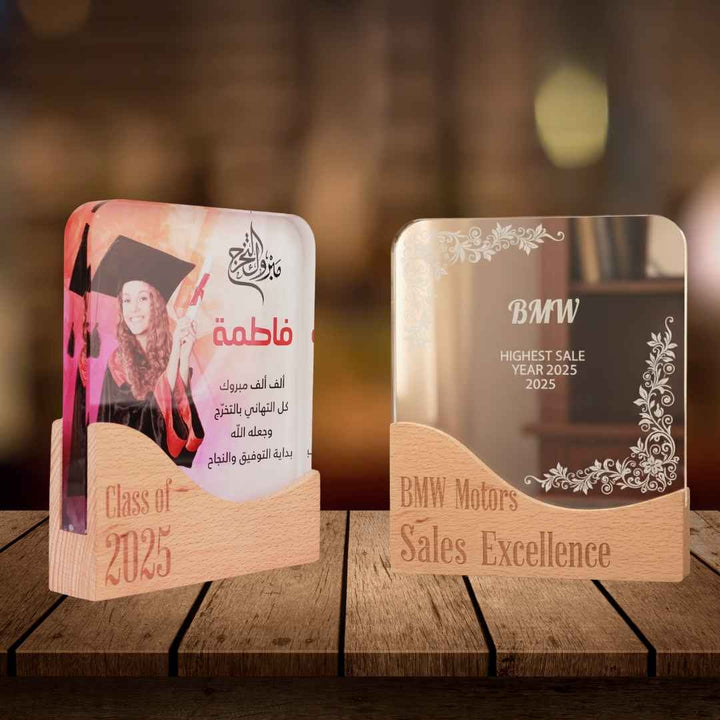 • تشطيب أنيق: مزيج من الزجاج الشفاف والخشب الطبيعي يضفي مظهرًا أنيقًا ومناسبًا للتكريم الرسمي والاحتفالي.