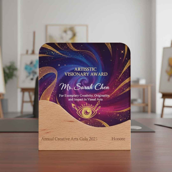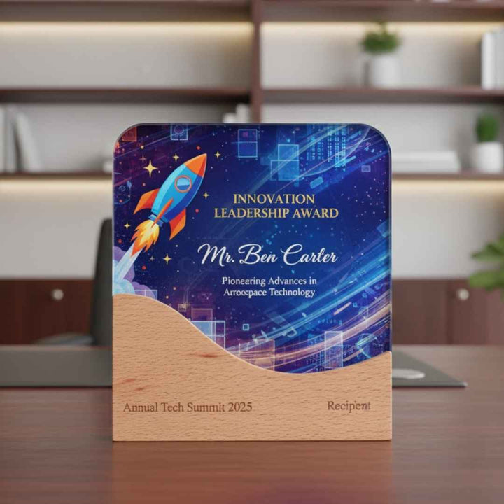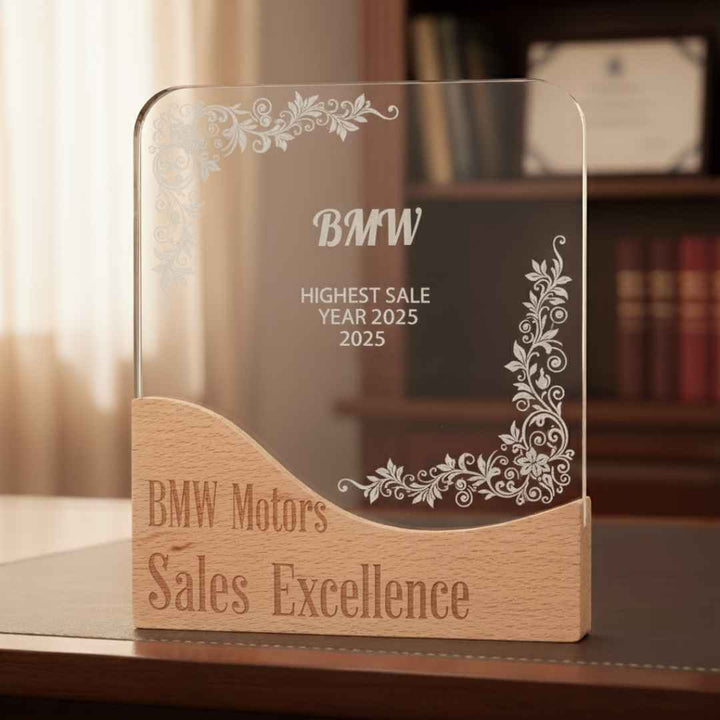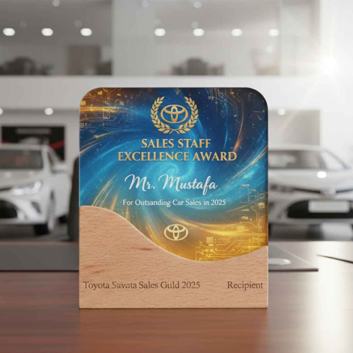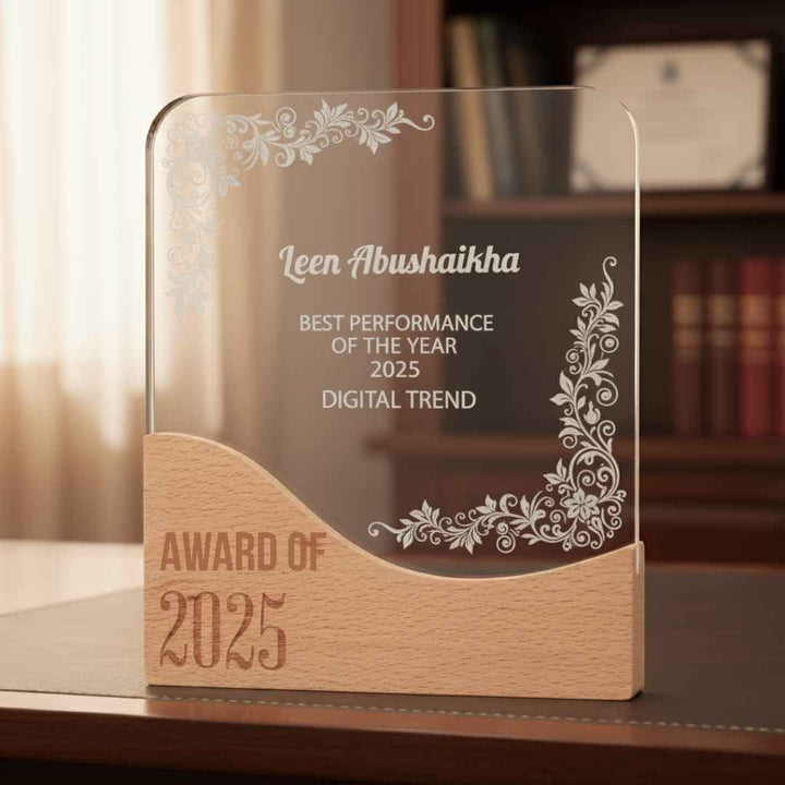 • زجاج عالي الجودة وقاعدة من الخشب: تُثبّت الجائزة على قاعدة خشبية متينة، توفر متانة ومظهرًا فخمًا.