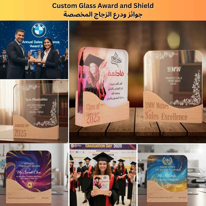 تقدّر التميّز وتحتفل بالإنجازات مع جائزة الزجاج المخصصة لدينا، وهي كأس أنيق وقابلة للتخصيص مناسبة لمجموعة واسعة من المناسبات. مصنوعة من زجاج عالي الجودة ومزيّنة بقاعدة من الخشب، تجمع هذه الجائزة بين الرقي والتنوع، مما يجعلها قطعة تكريم مثالية للمدارس، الجامعات، الفعاليات الشركاتية، والحملات الترويجية.