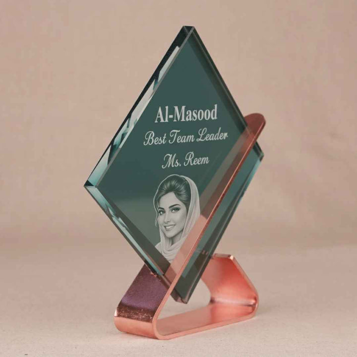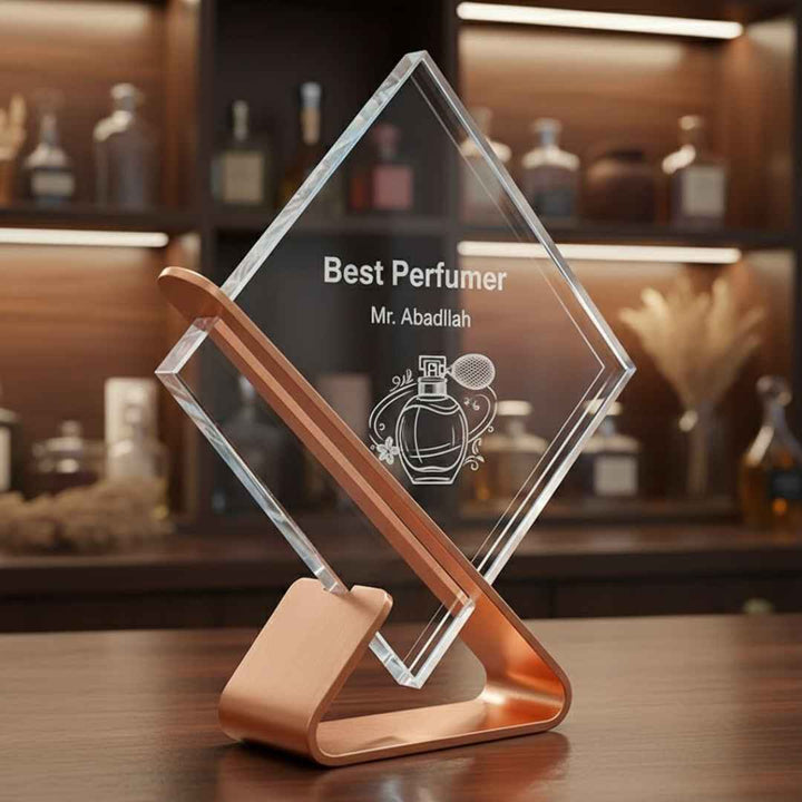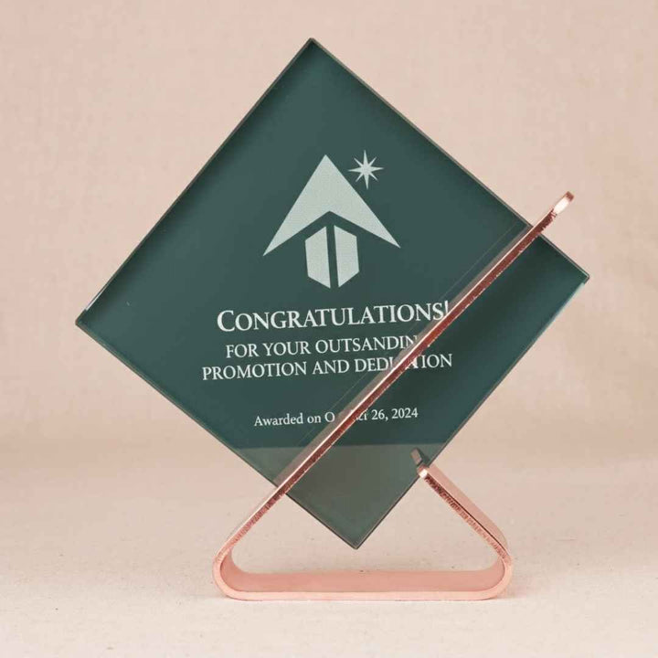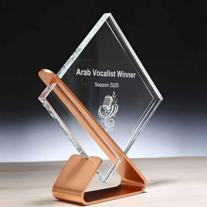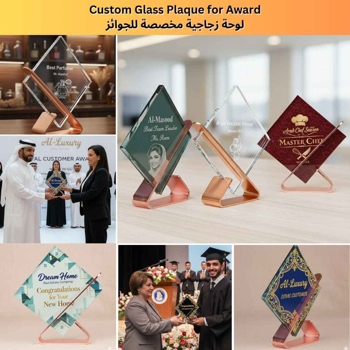 - زجاج عالي الجودة وقاعدة من المعدن: اللوحة الزجاجية مثبتة على قاعدة معدنية متينة، وتوفر مظهرًا أنيقًا ومهنيًا مناسب لجميع فعاليات التقدير.